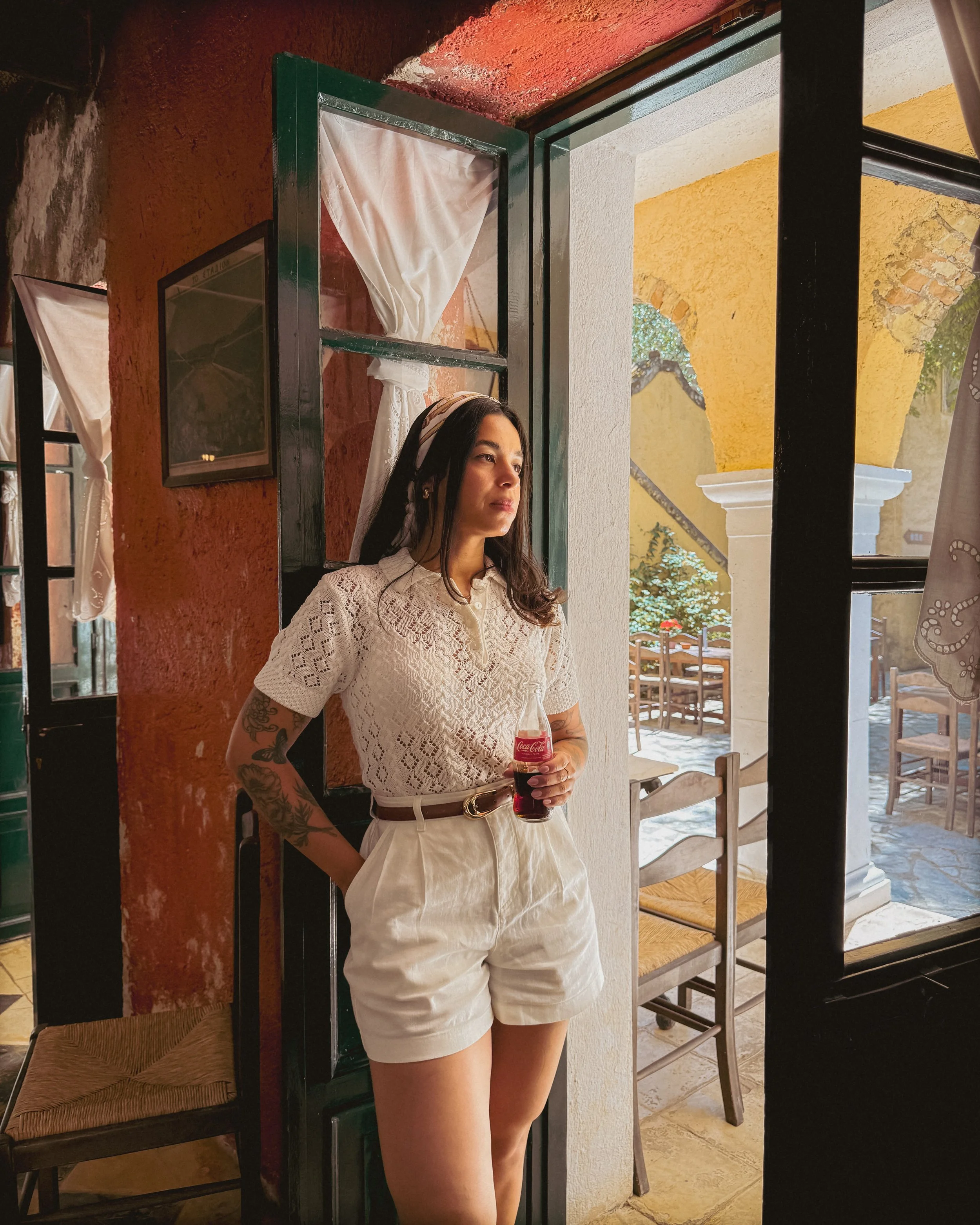On another day, I visited Danilia Village, a recreated 1930s Corfiot town that felt like walking into a perfectly preserved film set. I wandered its pastel-coloured streets, sat in the shade with a Coca-Cola, and imagined myself as a character in a vintage summer romance. Later, I explored the UNESCO-listed Old Town Corfu, losing myself in a maze of Venetian architecture, flower-draped balconies, and little shops selling olive oil, handmade ceramics, and crisp linen dresses. I let my feet guide me down cobbled lanes, turning corners simply because I wanted to see what was there. Without a companion’s pace to match, I moved at my own rhythm, sometimes slow enough to notice the details in the archways, sometimes quick to catch a glimpse of the sea through an alleyway before it vanished again.